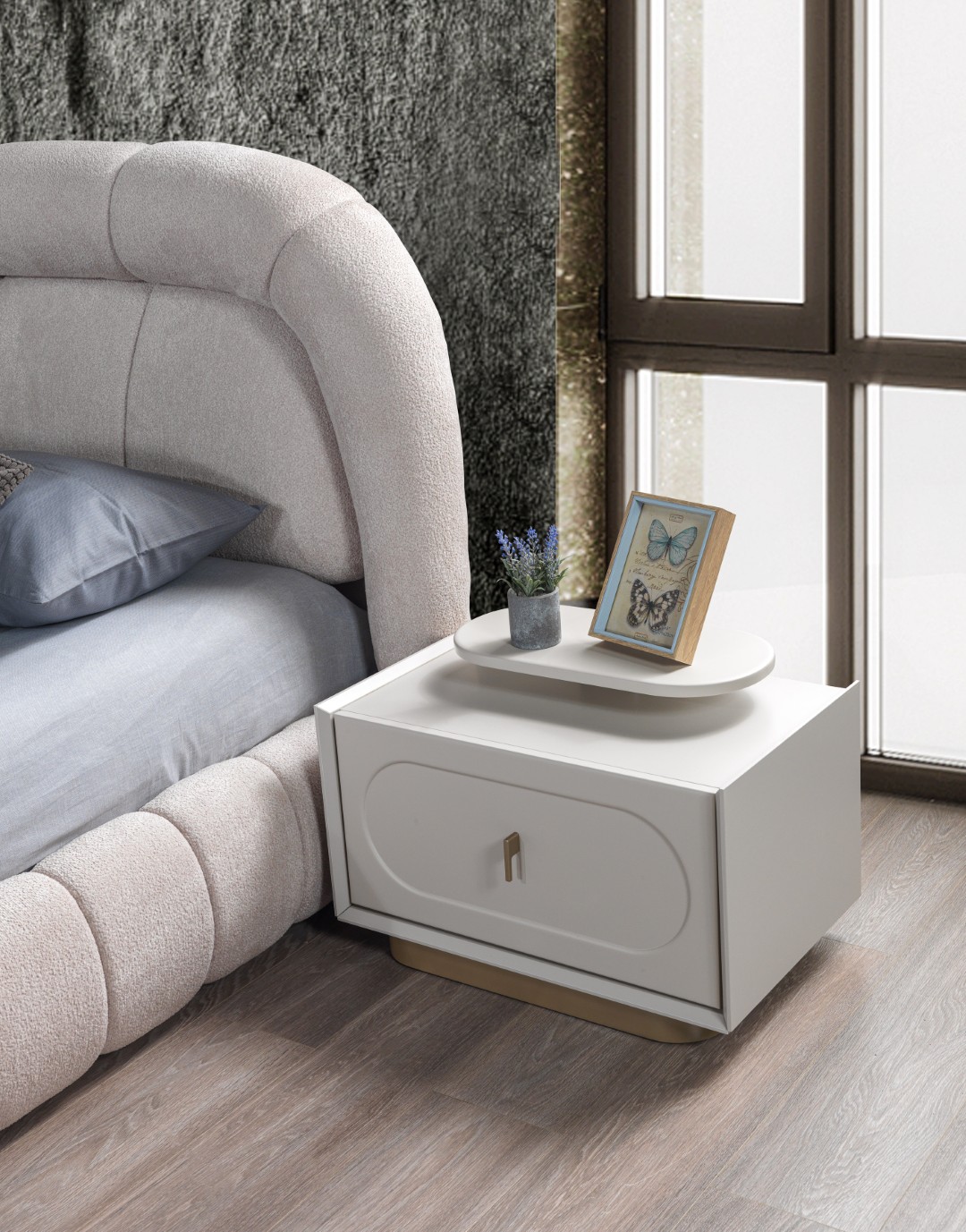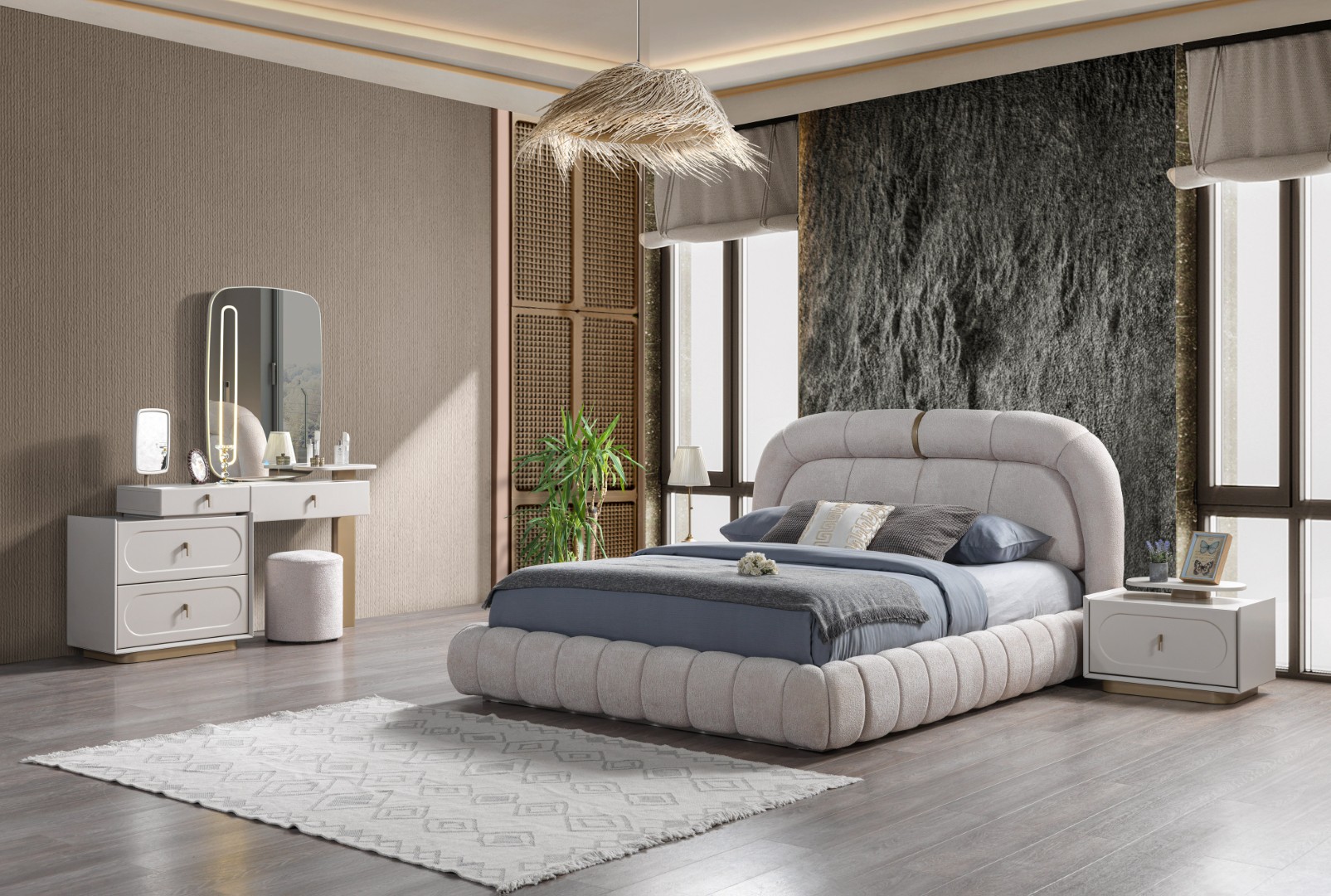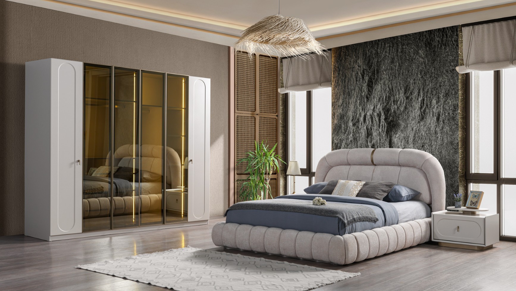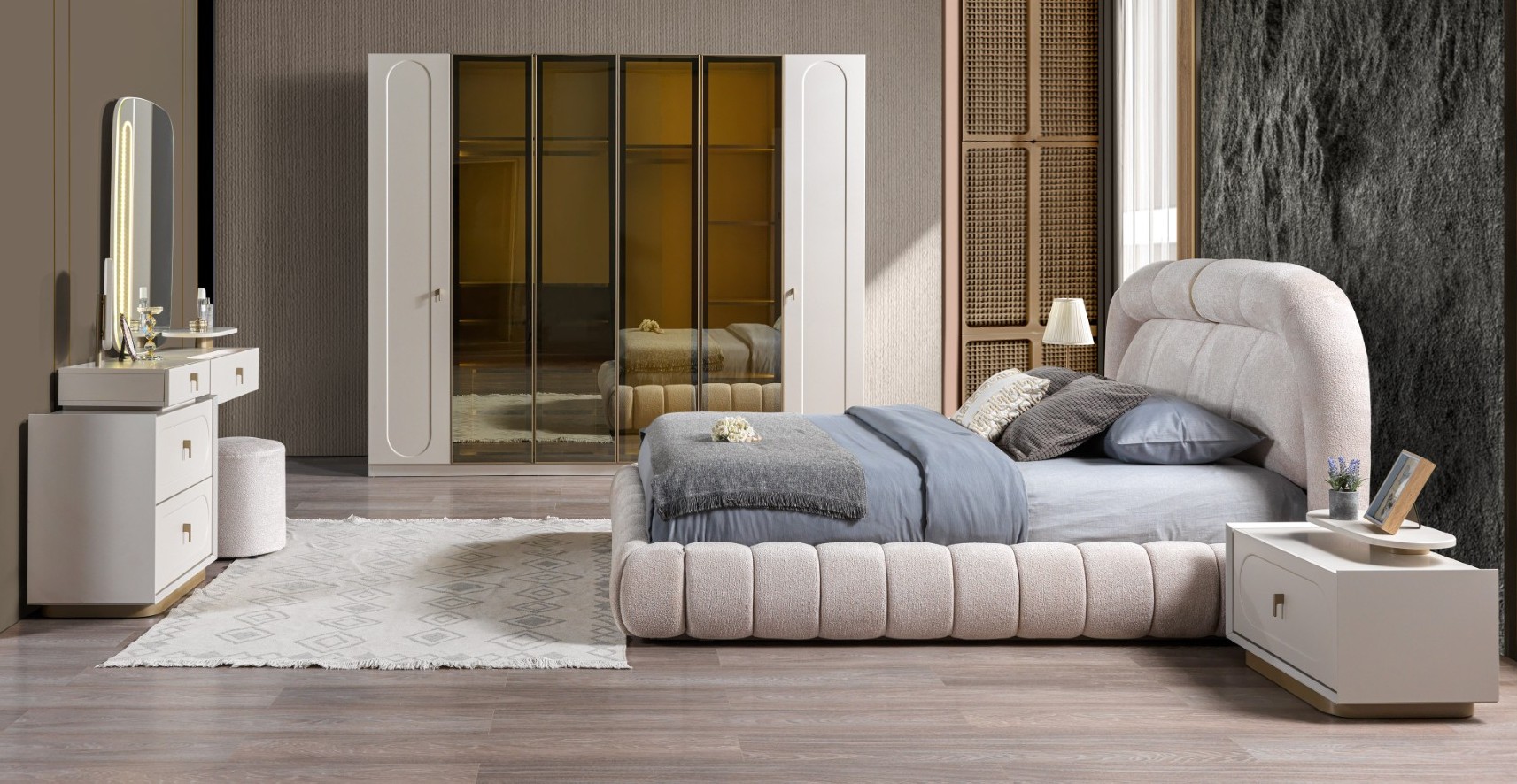 Fiyata dahil parçalar ; 1 Adet Dolap,1 Adet Şifonyer ve aynası, 2 Adet komidin, 1 Adet Bazalı karyola 160 lık