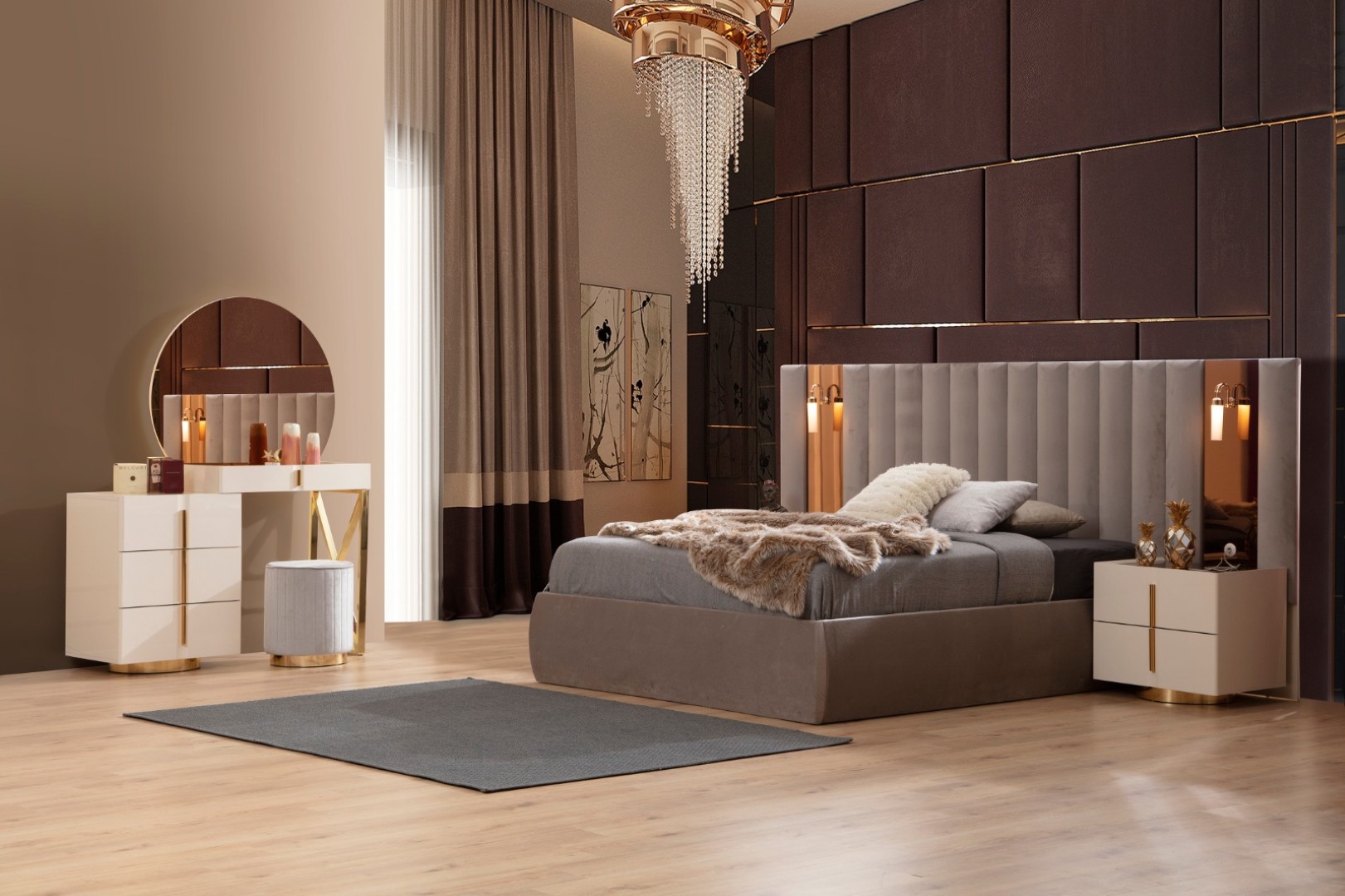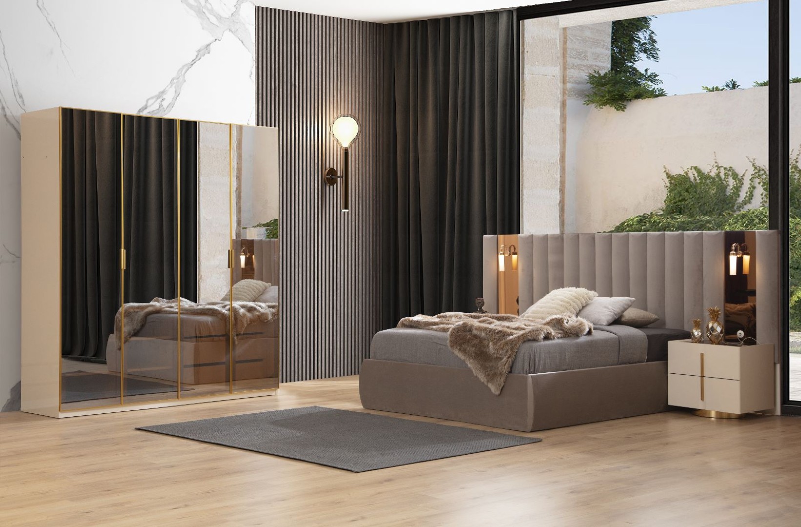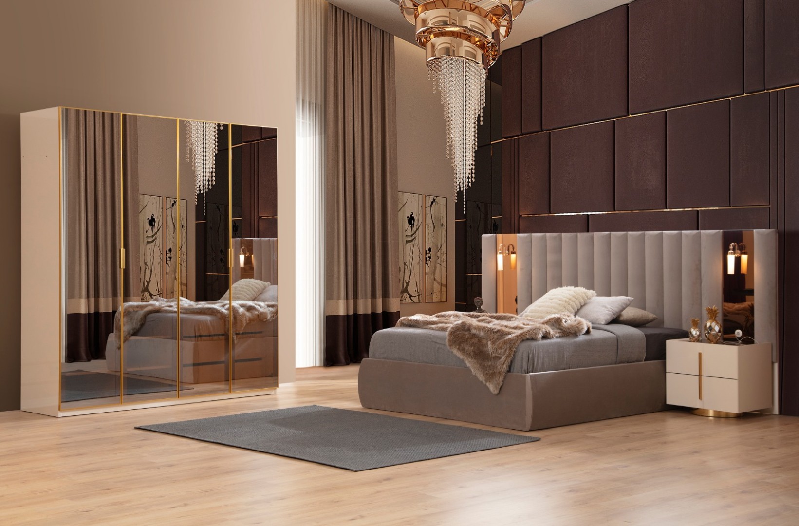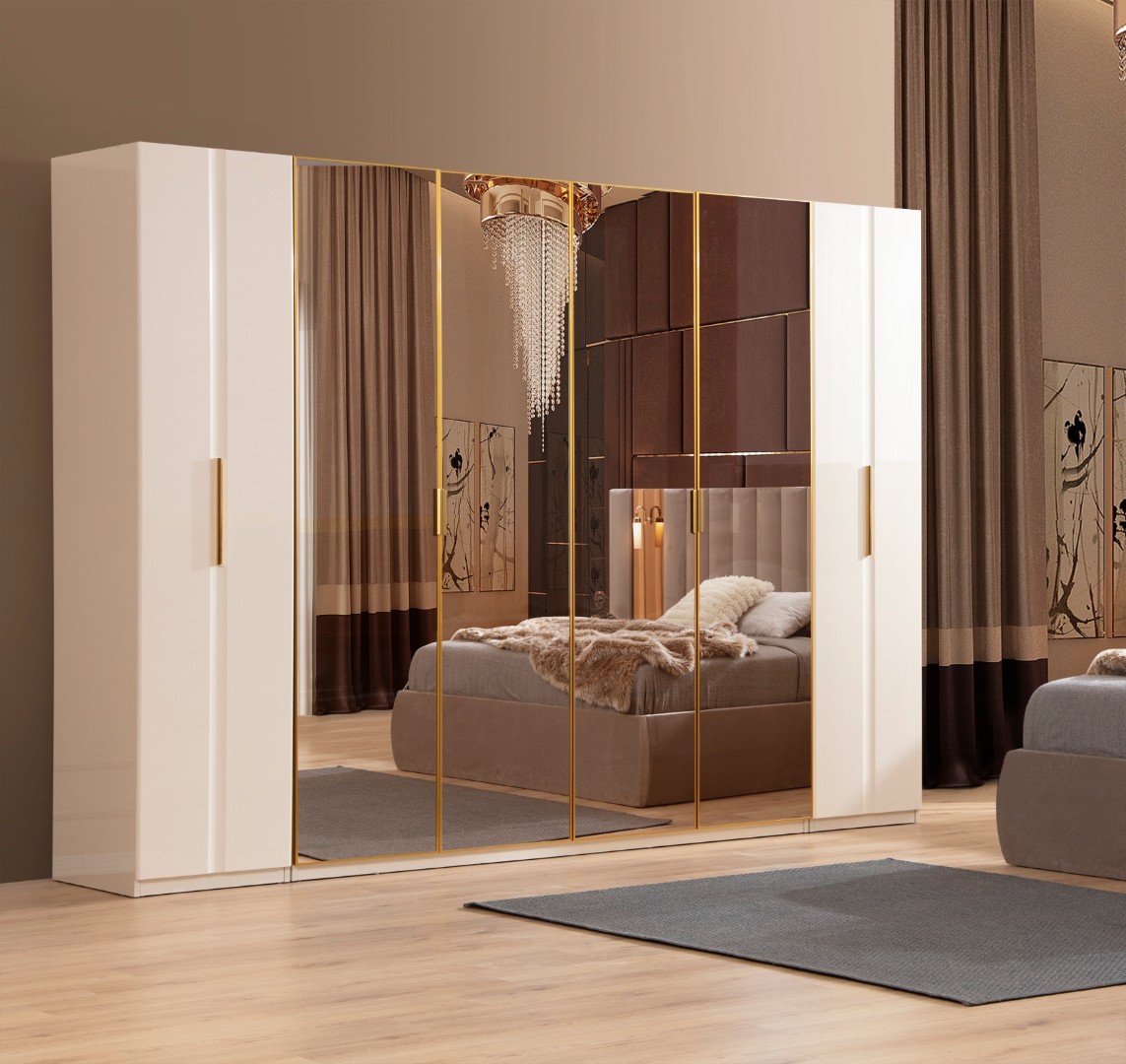Fiyata dahil parçalar ; 1 Adet 6 Kapılı Dolap, 1 Adet Şifonyer ve ayna, 2 Adet komidin, 1 Adet Bazalı karyola 160 lık