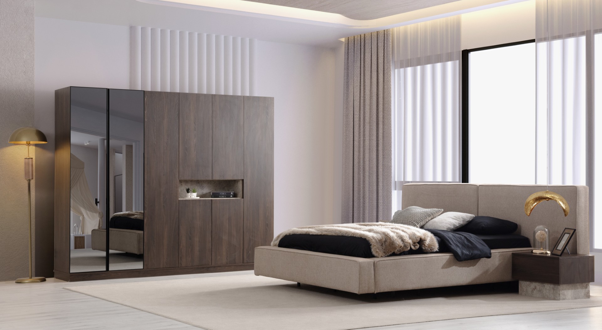 Fiyata dahil parçalar ; 1 Adet Dolap, 1 Adet Şifonyer ve ayna, 2 Adet komidin, 1 Adet Bazalı karyola 160 lık