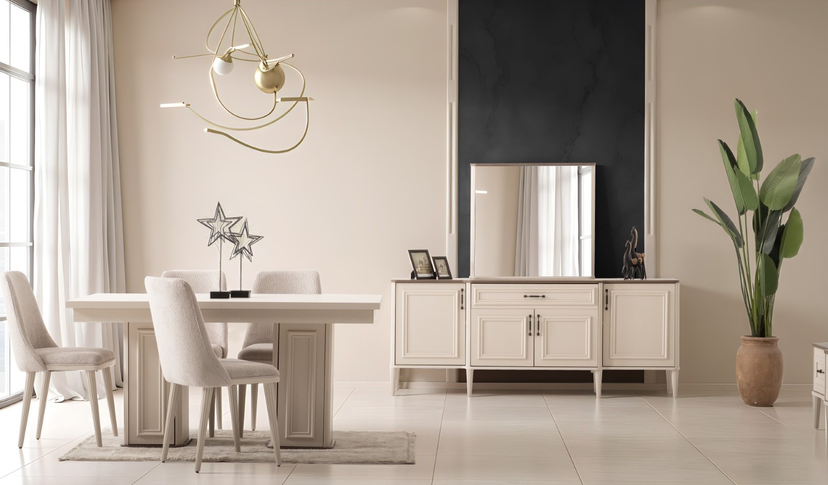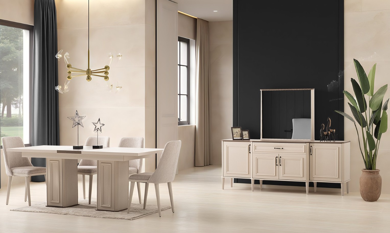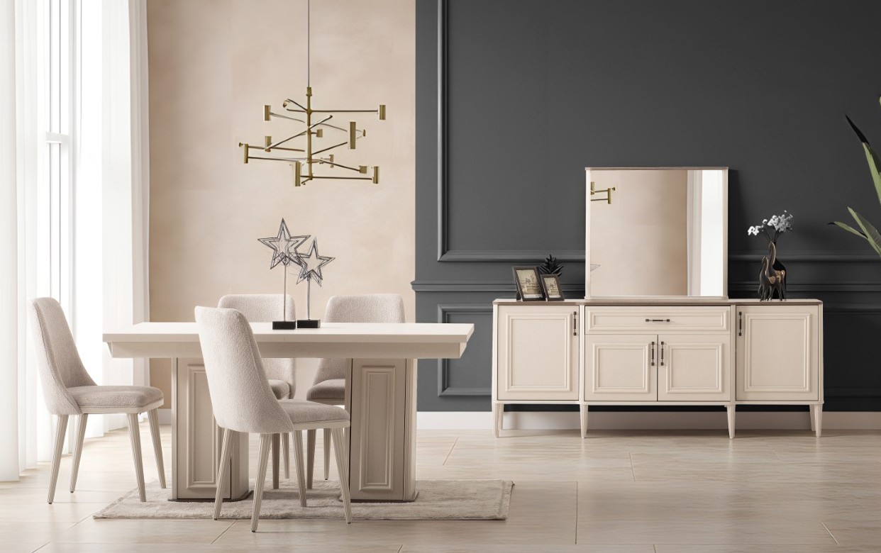 Fiyata dahil parçalar ; 1 Adet Açılır Yemek Masası, 6 Adet Sandalye, 1 Adet Konsol ve ayna