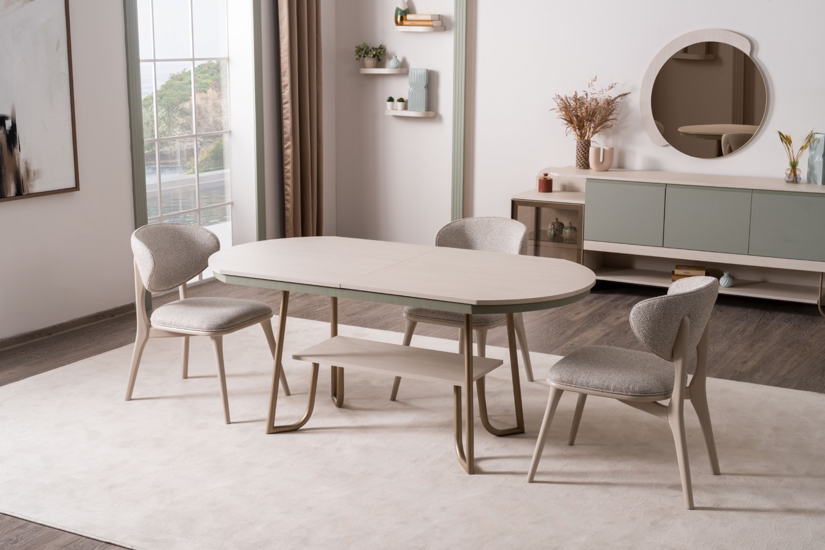 Fiyata dahil parçalar ; 1 Adet Açılır Yemek Masası , 6 Adet Sandalye, 1 Adet Konsol ve aynaları