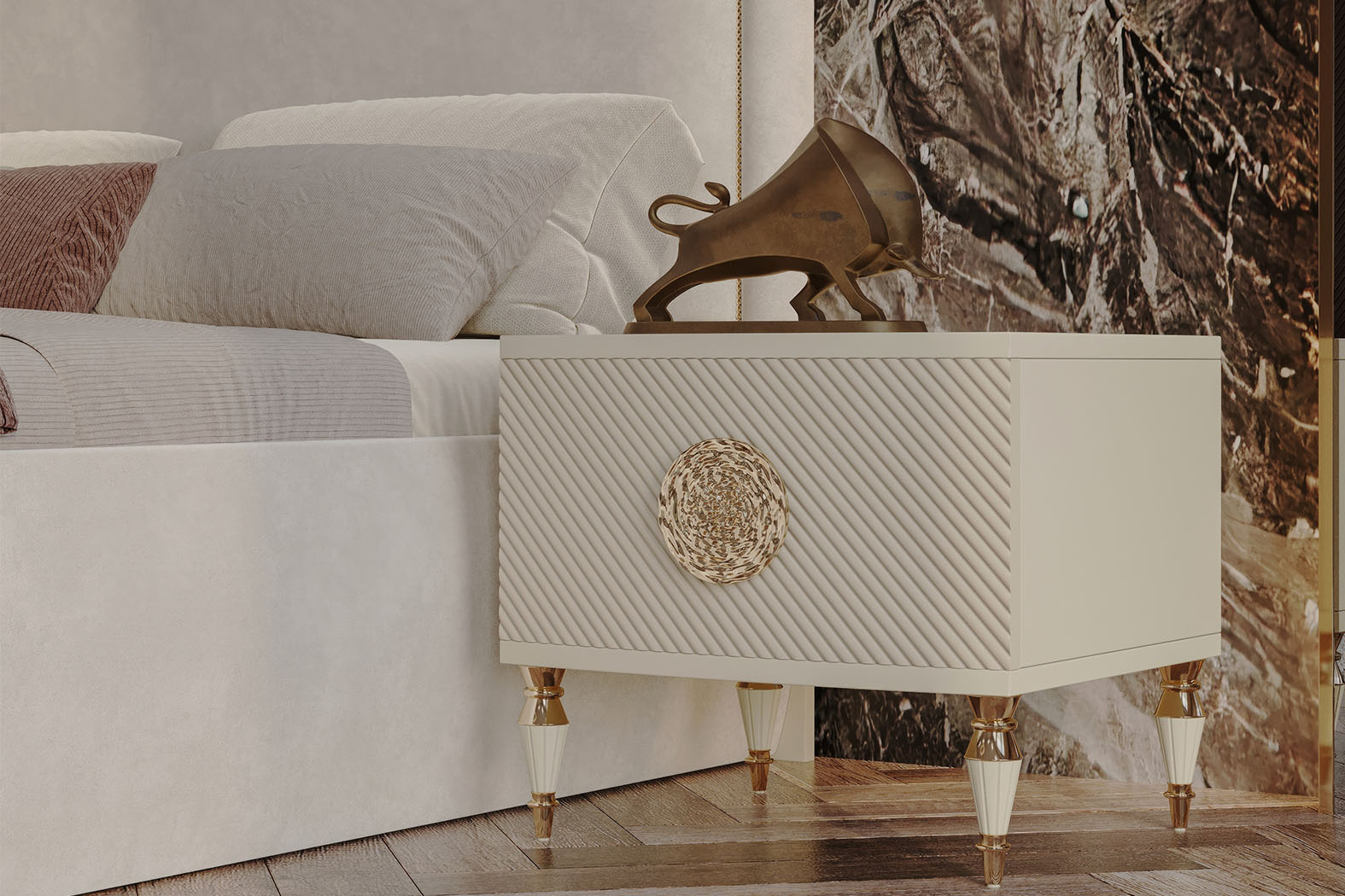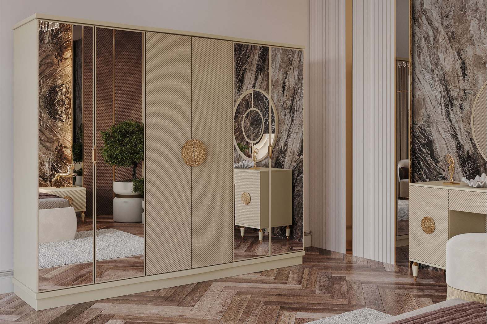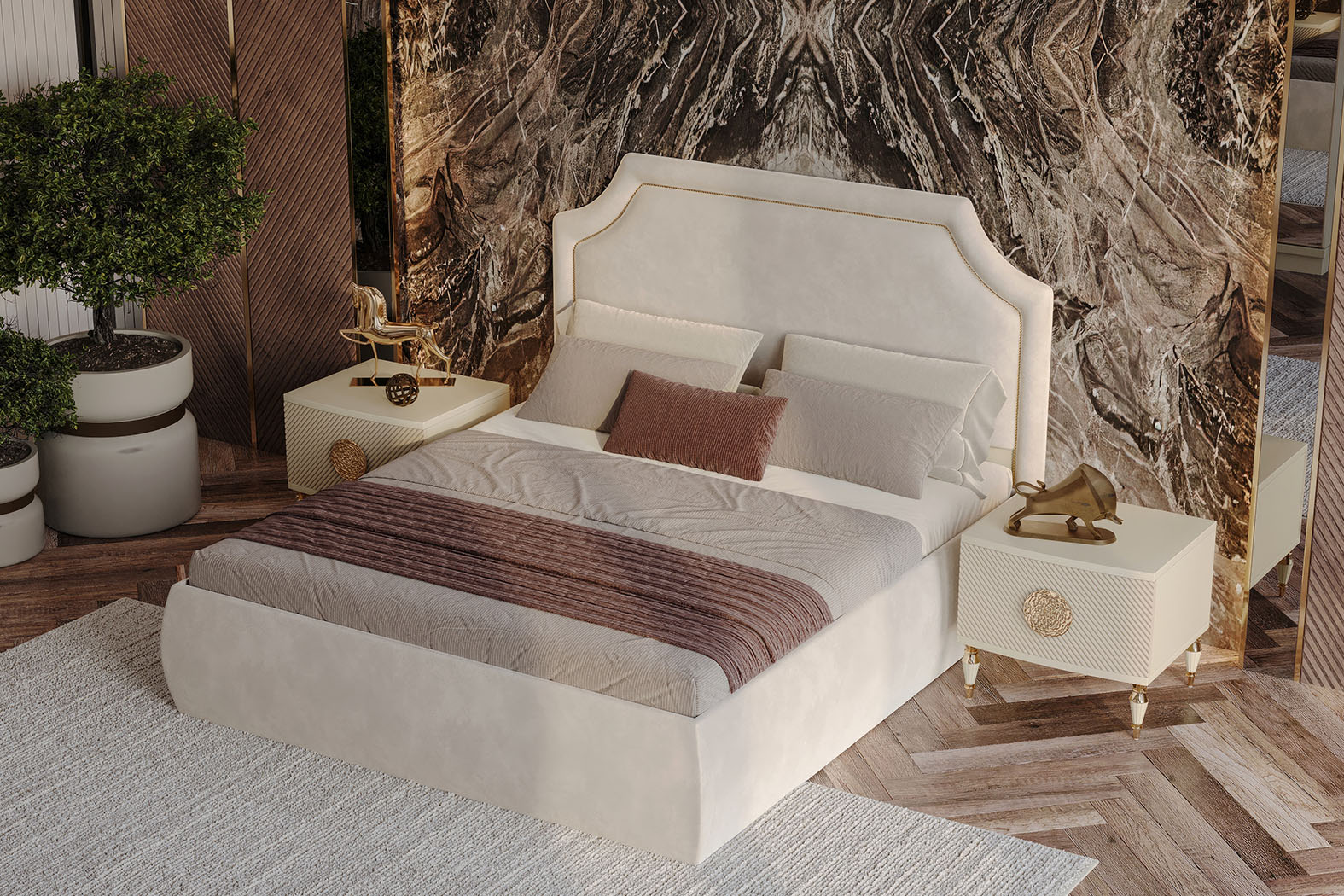 Fiyata dahil parçalar ; 1 Adet Dolap, 1 Adet Şifonyer ve ayna + puf , 2 Adet Komidin, 1 Adet Bazasız karyola - 180 x 200
