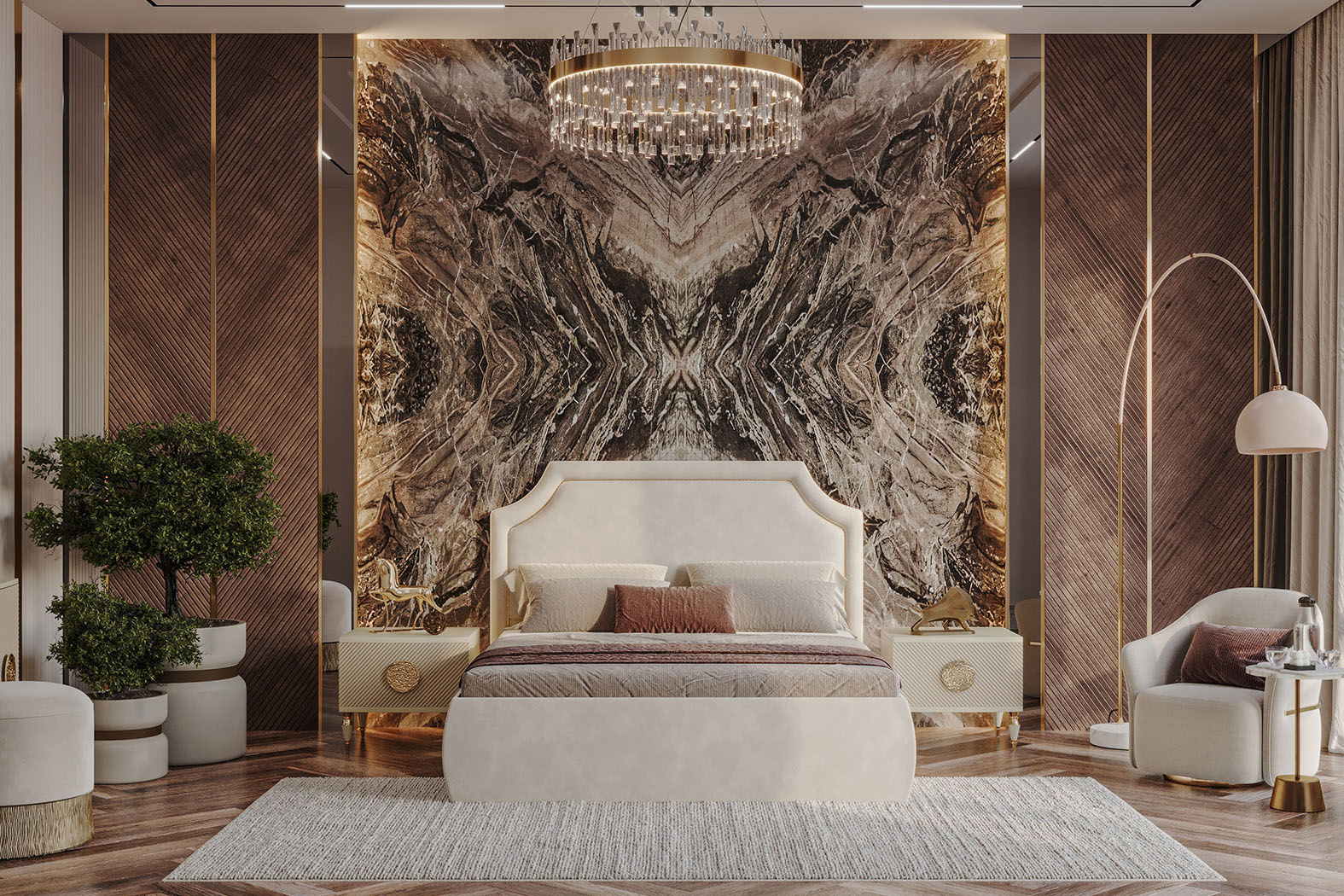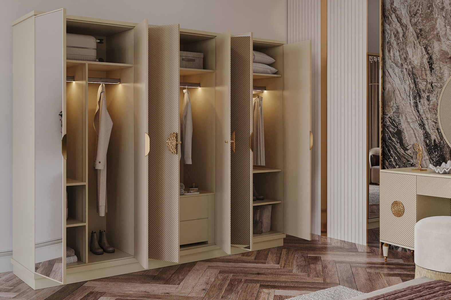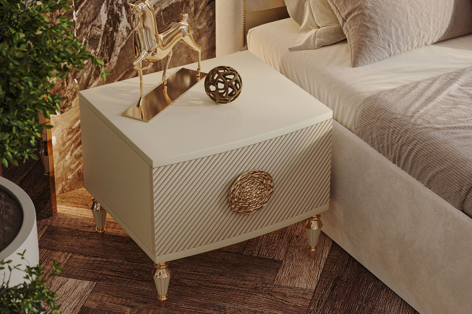 Fiyata dahil parçalar ; 1 Adet Dolap, 1 Adet Şifonyer ve ayna + puf , 2 Adet Komidin, 1 Adet Bazasız karyola - 180 x 200