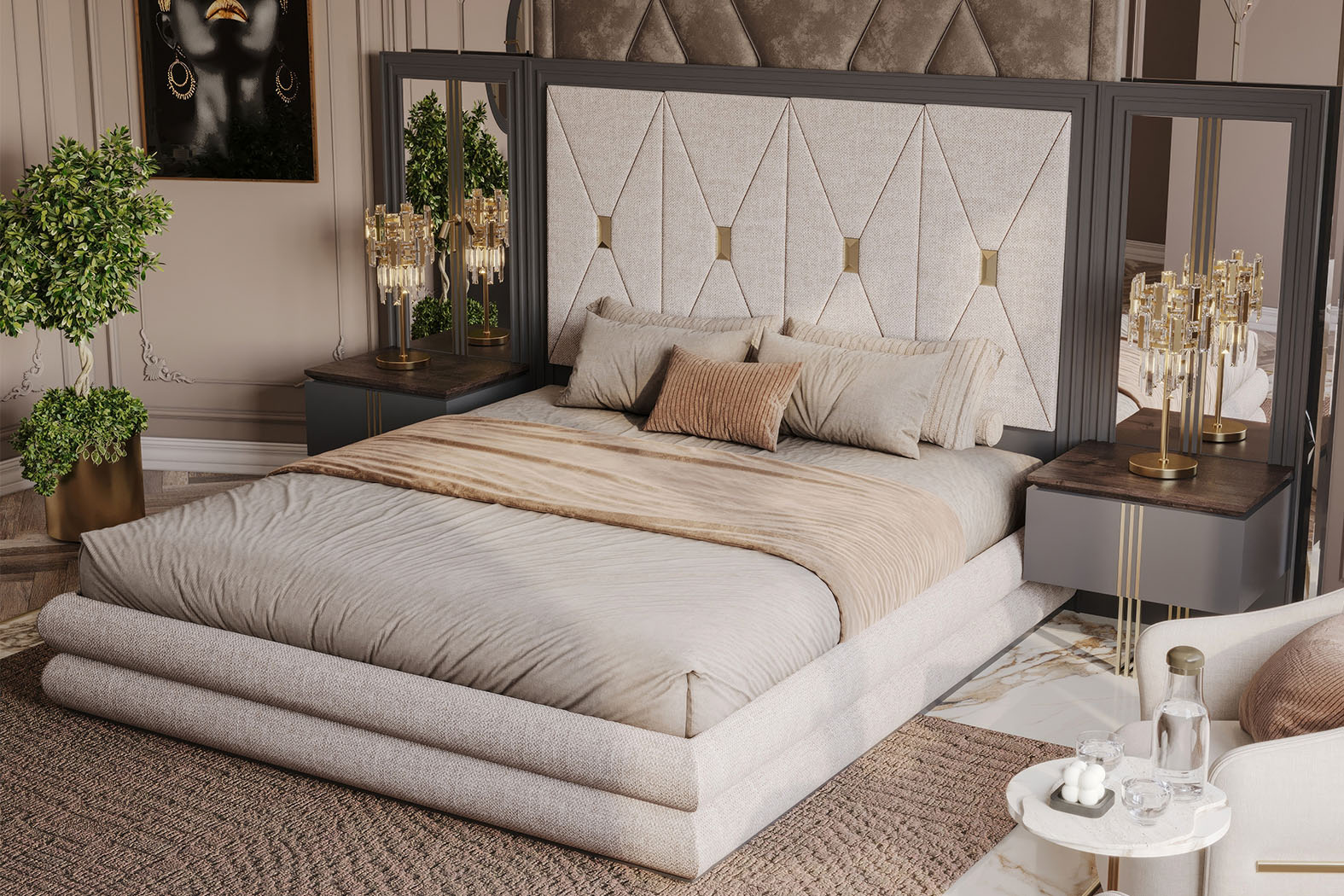 Fiyata dahil parçalar ; 1 Adet Dolap, 1 Adet Şifonyer ve ayna + Puf, 2 Adet Komidin, 1 Adet Bazasız karyola - 180 x 200