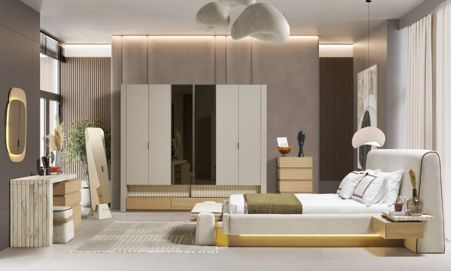 Fiyata dahil parçalar ; 1 Adet Dolap, 1 Adet Şifonyer, 2 Adet Komidin, 1 Adet Bazalı karyola