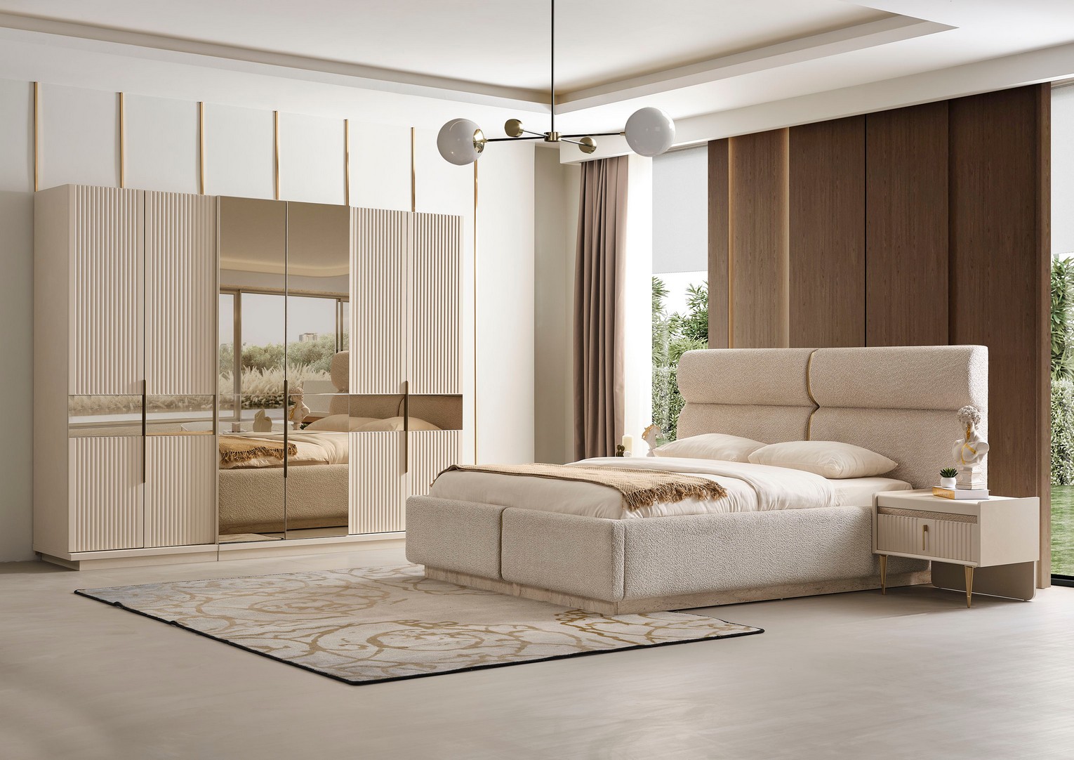 Fiyata dahil parçalar ; 1 Adet 4 Kapılı Dolap, 1 Adet 2 Kapılı Dolap,1 Adet Şifonyer , 2 Adet komidin, 1 Adet Bazasız karyola 160 lık